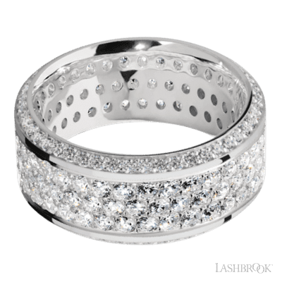 10 mm wide/High Bevel/14K White Gold band with a Bevel Eternity arrangement of .01 carat Round Diamond stones in a Bead setting and featuring a a 3 Row Eternity arrangement of .03 carat Round Diamond stones in a Bead Channel setting