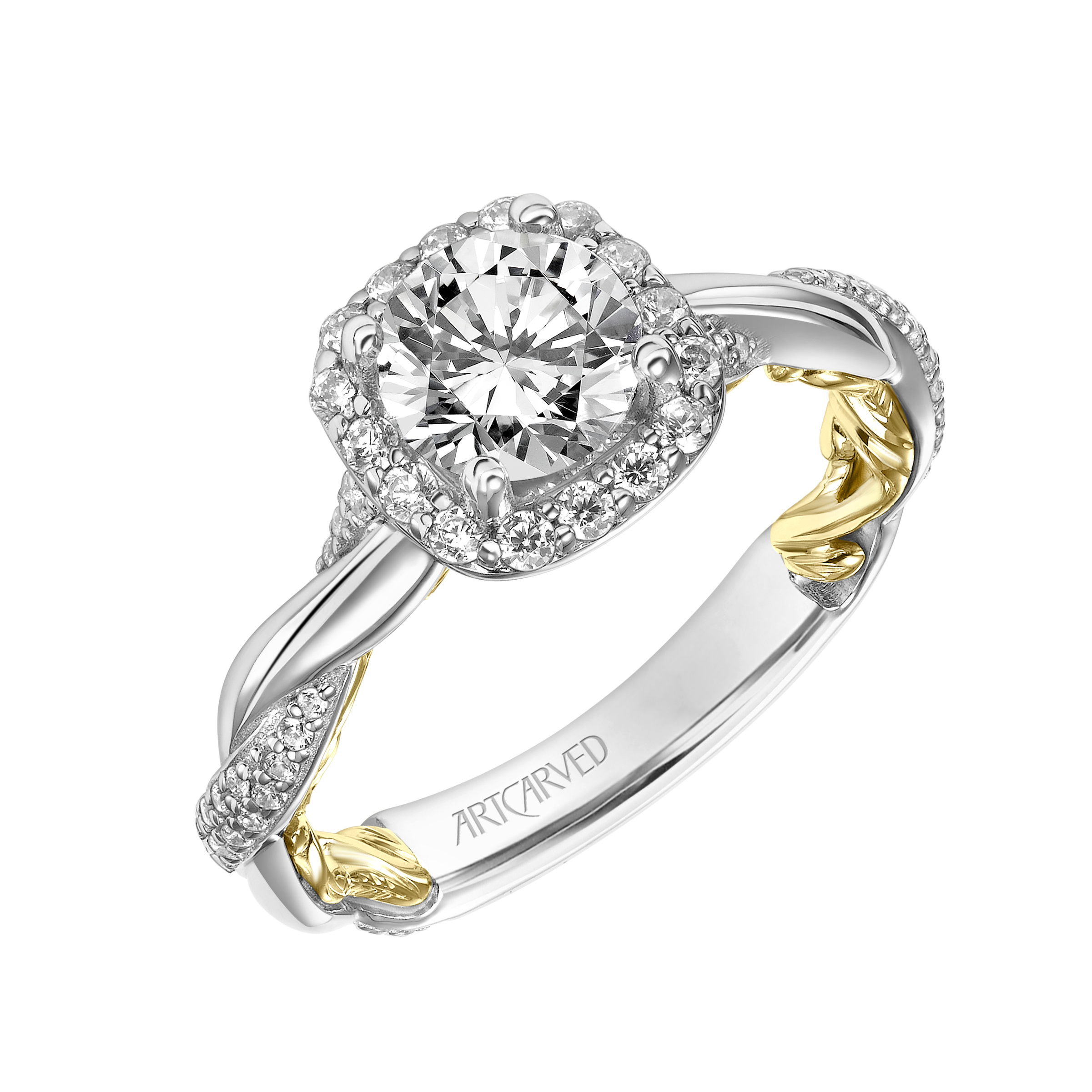 31-V933ERWY-E.01 – ARTCARVED – Lyric Engagement Ring with Cushion Diamond Halo and Accented Diamond Gallery with Twist Diamond and Polished Shank