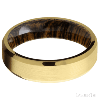 6 mm wide Beveled 18K Yellow Gold band featuring a Bocote sleeve.