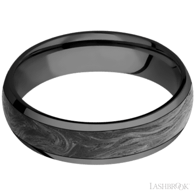 6 mm wide/Domed/Zirconium band with one 4 mm Centered inlay of Forged Carbon Fiber.