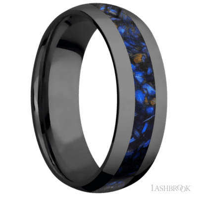 7 mm wide/Domed/Zirconium band with one 3 mm Centered inlay of Blue Tiger Eye.