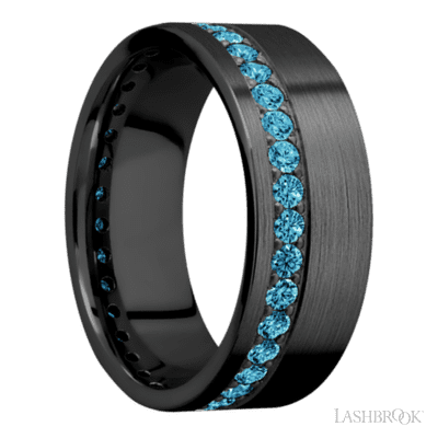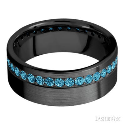 8 mm wide/Flat/Zirconium band with a Off Center Eternity arrangement of .03 carat Round Lab Blue Diamond stones in a Bead setting.