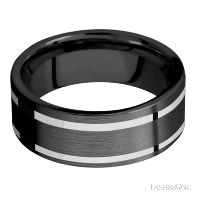 8 mm wide/Flat/Zirconium band with two 1 mm Wide inlays of 14K White Gold.