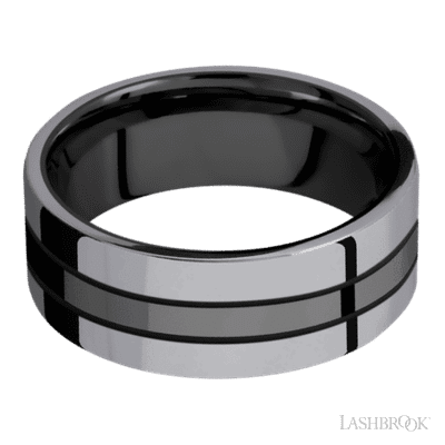 8 mm wide/Flat/Zirconium band with two 3 mm Double Off Center Edge inlays of Tantalum.