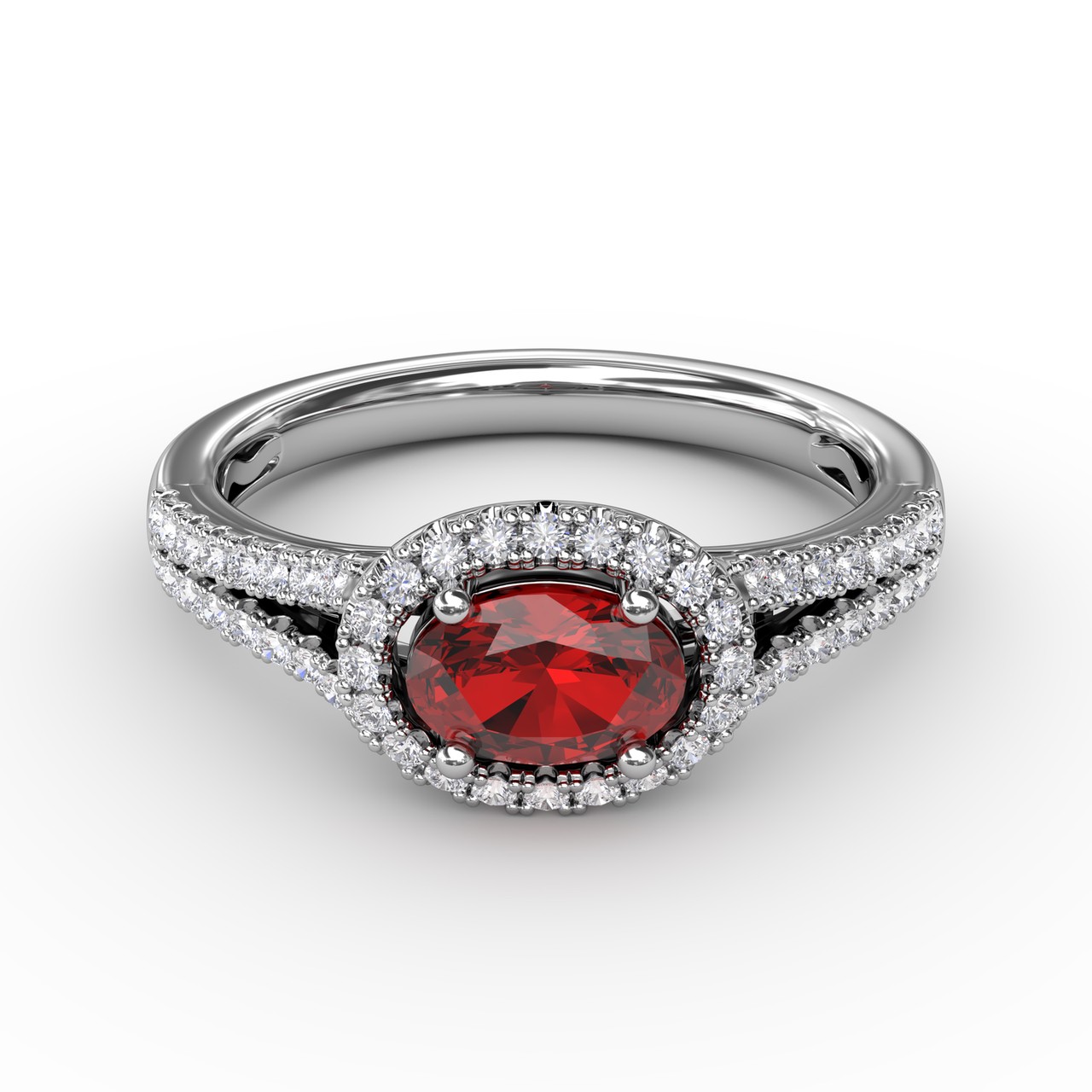 This ruby ring features a diamond halo and split shank encrusted with diamonds. This design can be customized based on stone shape and metal preference.