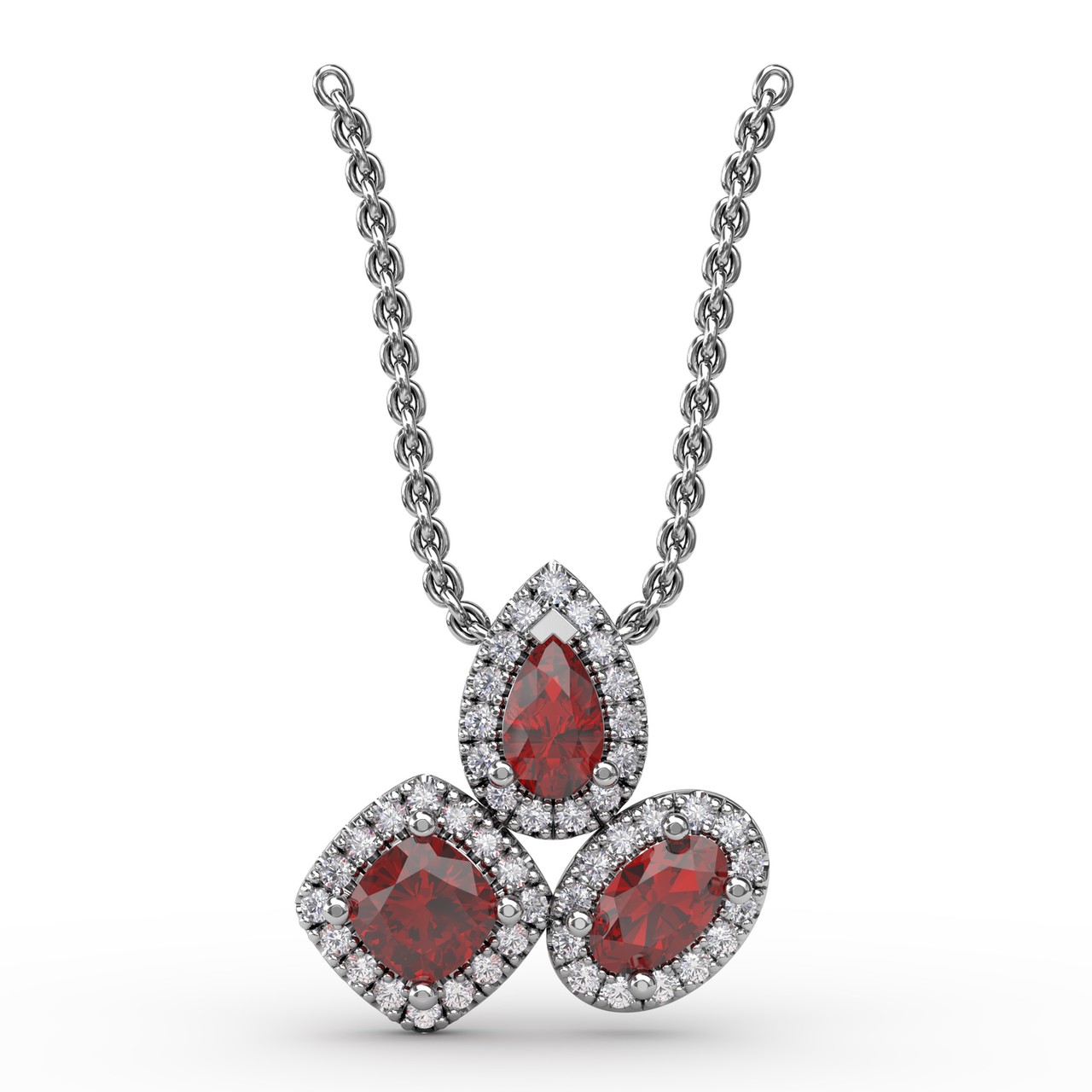 An abstract collection of three precious rubies surrounded by pavé diamonds for the most perfect mix of luxury and elegance. This pendant comes in a variety of material types like 14k white gold, yellow gold, White gold and can be customized. Fana gemstone pendants are perfect for that special woman in your life.