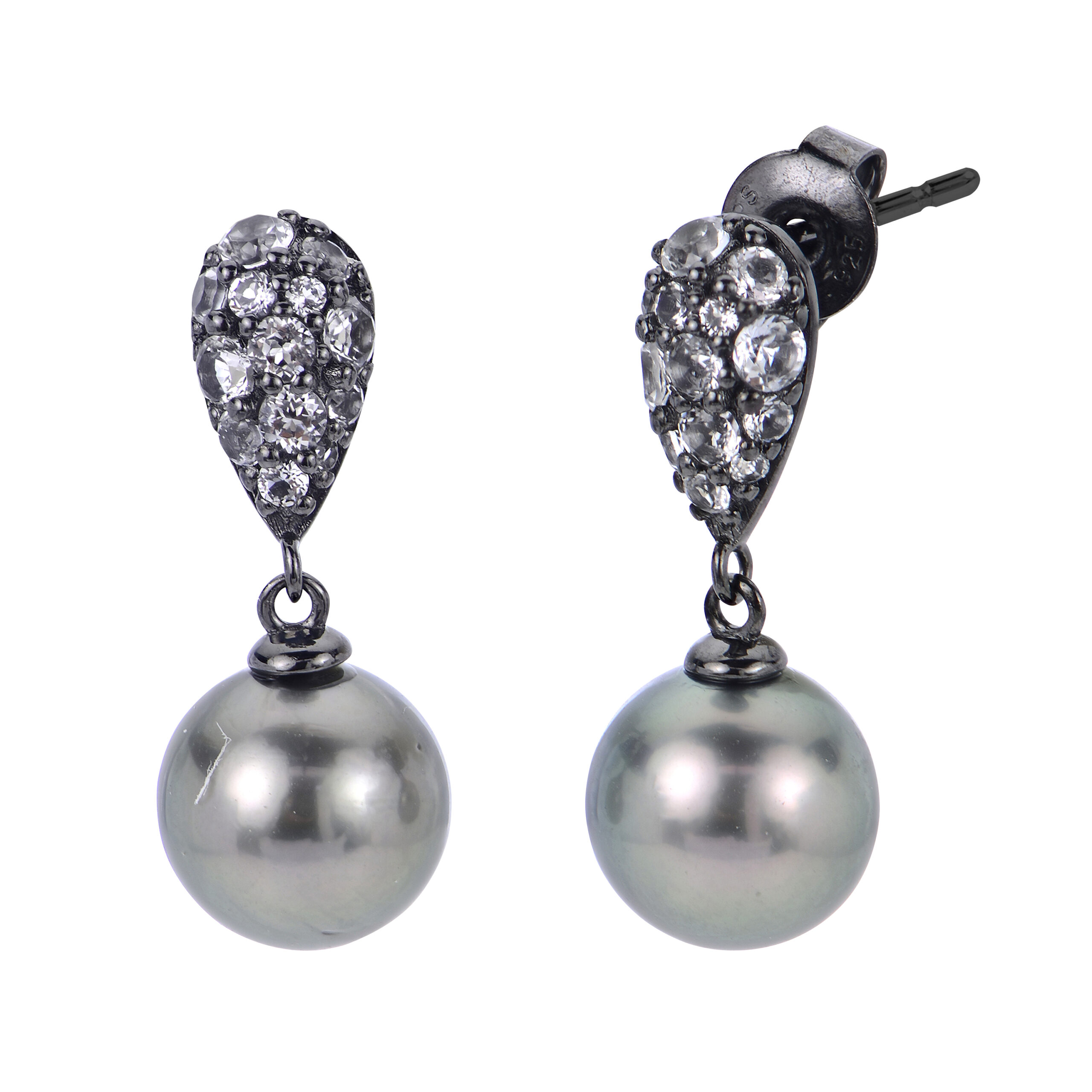 925 BLK RHD 8-9MM TAHITIAN & WHITE TOPAZ EARRING