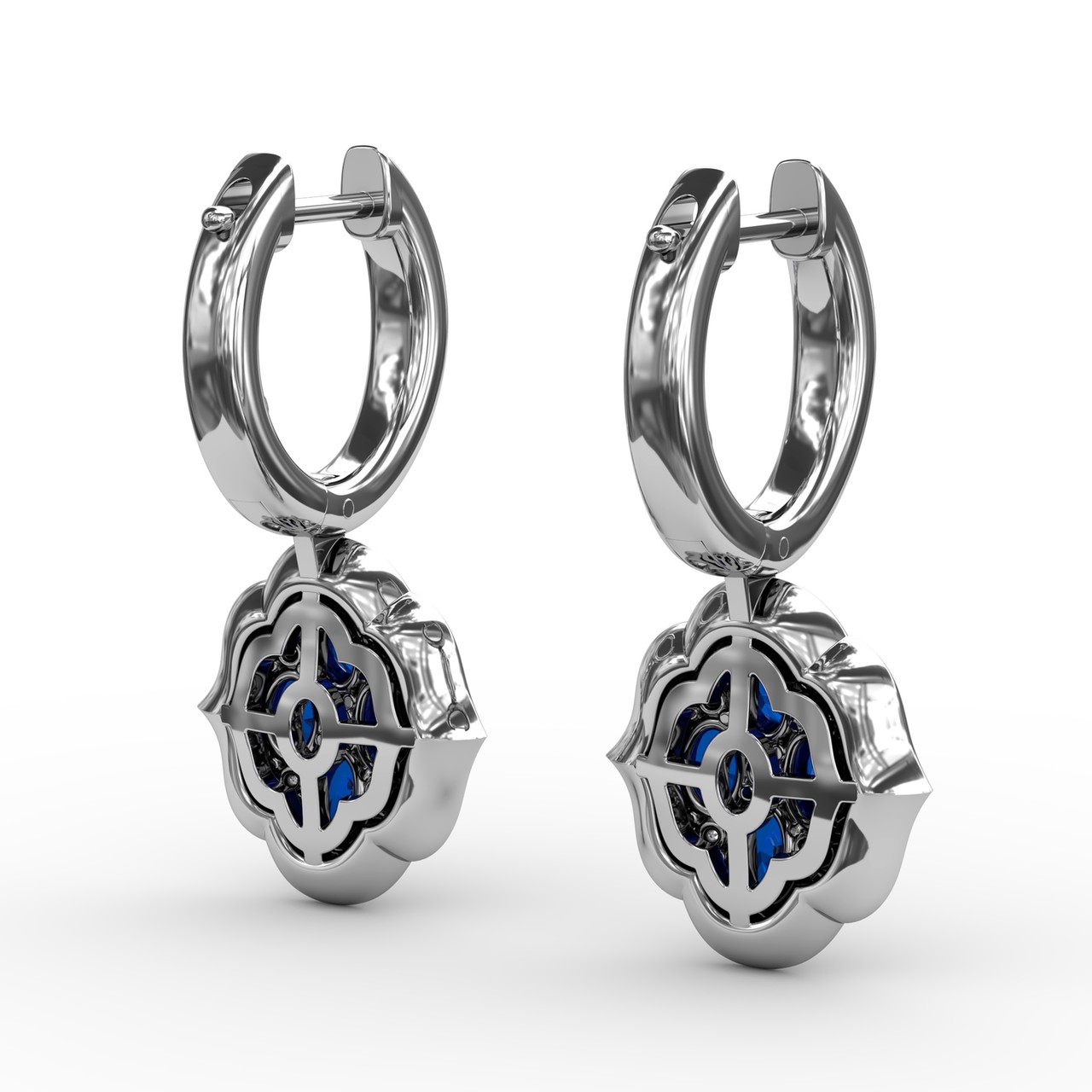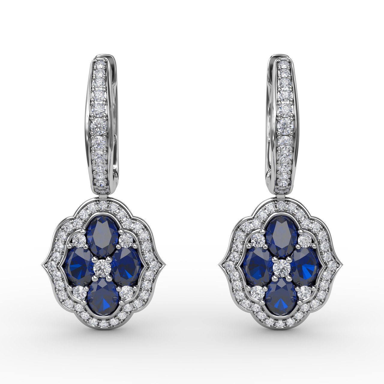 These beautiful victorian style sapphire and diamond dangle earrings come in a variety of material types like 14k white gold, yellow gold, White gold and can be customized. Fana diamond earrings are perfect for that special woman in your life.